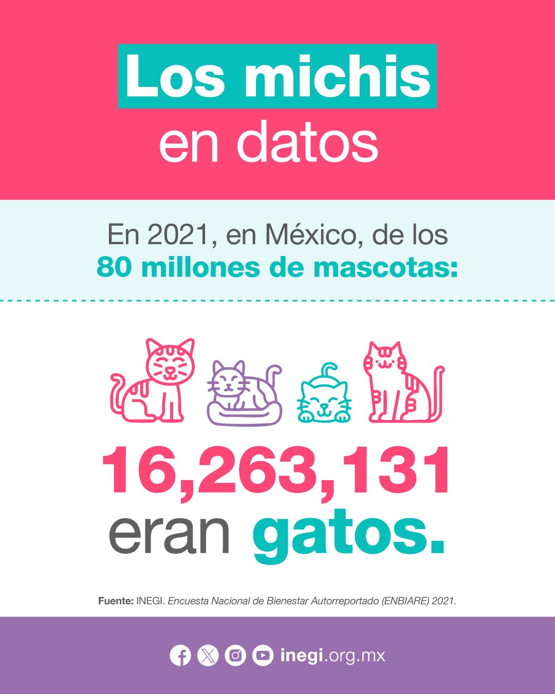 El INEGI destacó que, además de ser compañeros para millones de personas, los gatos forman parte de la vida cotidiana y del bienestar emocional de las familias.